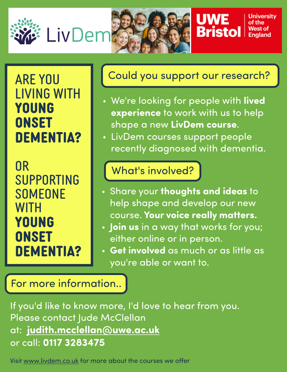 A researcher at University of the West of England (Bristol) is embarking on a project focused on improving support for people after diagnosis. They are setting up a group for people living with young onset dementia who are willing to share their thoughts and ideas to help shape and develop a new LivDem course. Your voice really matters, and you can get involved in a way that works for you, for as long as you want to. Take a look at the flyer for more information or email Jude to find out more judith.mcclellan@uwe.ac.uk, or telephone 0117 3283475.